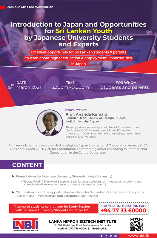 The webinar on “Introduction to Japan and Opportunities for Sri Lankan Youth” will be conducted on 19th march from 3.30pm to 5.00pm by Japanese University Students and Experts for the 4th time. Don’t miss this great opportunity.