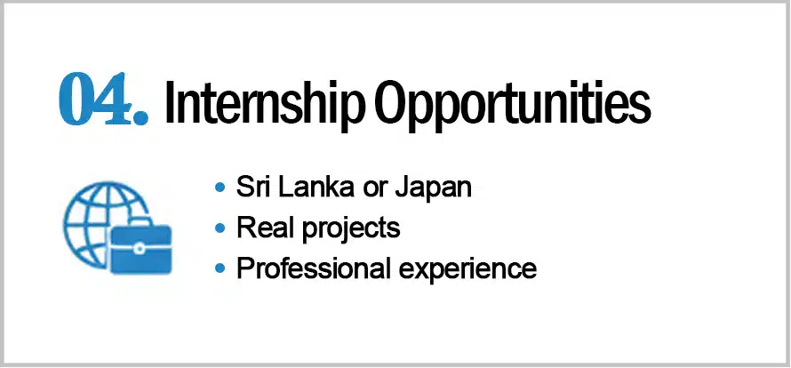 Gain real-world experience through internship opportunities in Sri Lanka and Japan. Develop professional confidence and apply your knowledge in real working environments.