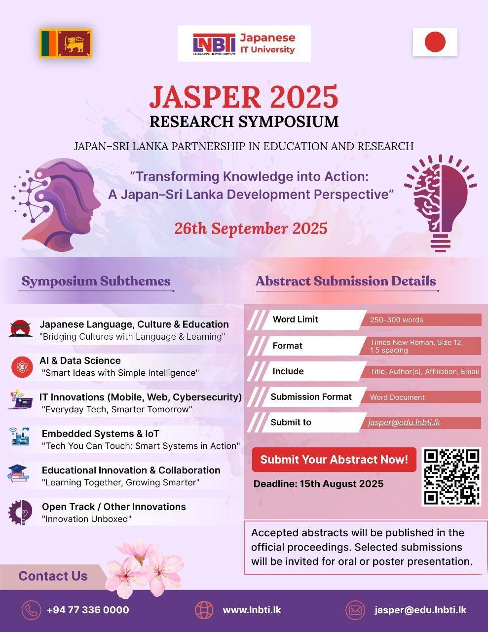 Welcome to JASPER 2025, research symposium of the Lanka Nippon BizTech Institute. This isn’t just a symposium  it’s a stage where bold ideas meet real-world challenges, where Japan and Sri Lanka’s partnership sparks breakthroughs, and where young innovators and seasoned experts stand shoulder to shoulder in shaping tomorrow.