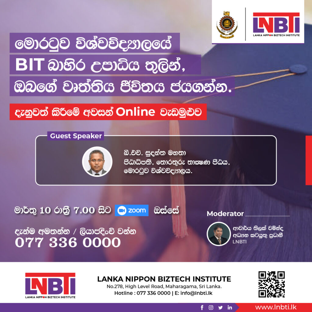 The University of Moratuwa BIT FINAL Awareness Workshop (FREE) will be held on 10th of March at 7.00 pm via Zoom with Mr. B. H. Sudantha, the Dean of Faculty of Information Technology, University of Moratuwa.